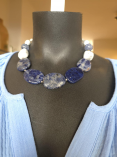 Collier en pierres semi précieuses absolument sublime. Howlite, laiton, aigue marine et sodalite. Tour de cou jusqu'à 50 cm.