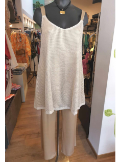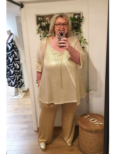 Pantalon en jersey extensible tout élastiqué brillant doré mat très chic. Il marque un peu mais si vous l'achetez avec le dessus en suggestion, c'est assez long et çà cache la cellullite sans problème. Il est par contre très long et il faudra peut-être penser à le raccourcir. Mais il est tellement magnifique n'est-ce pas ?