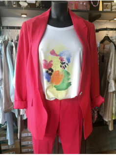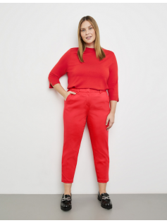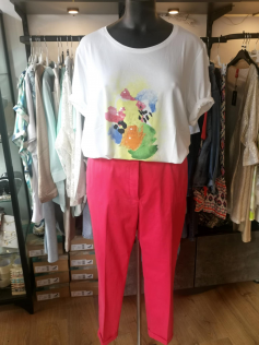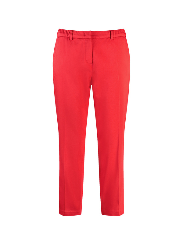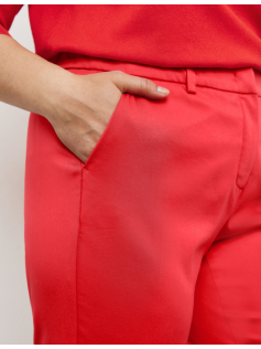 Pantalon corail tout doux (moins rouge que sur la photo, plus vers le framboise, une magnifique couleur) avec une taille confortable et élastiquée et une fermeture éclair. Forme 7/8 avec revers dans le bas. Attention, il convient aux cuisses fines à moyennes par rapport bien entendu à votre morphologie. Si vos cuisses posent un problème par rapport à votre taille normale de vêtements il n'est pas pour vous, mais pour toutes les autres, il est vraiment parfait et peut être aussi porté un peu plus large que sur la photo (je l'ai essayé mais il colle un peu trop mais pas impossible à porter). Il est en 67% coton, 30% polyester et 3% élasthanne). Entrejambe : 68 cm.