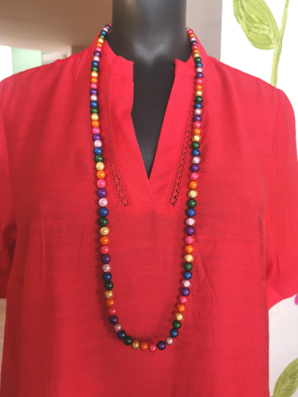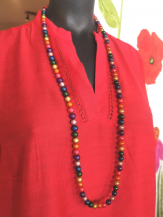 Long sautoir avec des perles de toutes les couleurs qui varient en fonction de l'intensite de la lumière.