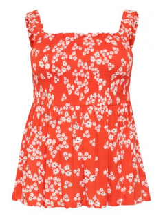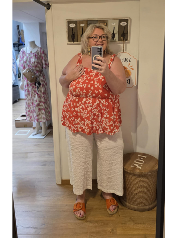 Adorable blouse fleurie orange avec le corsage smocké. Petites bretelles qui cachent le soutien. En 100% viscose écologique. Hauteur : 75 cm. Trop mimi.