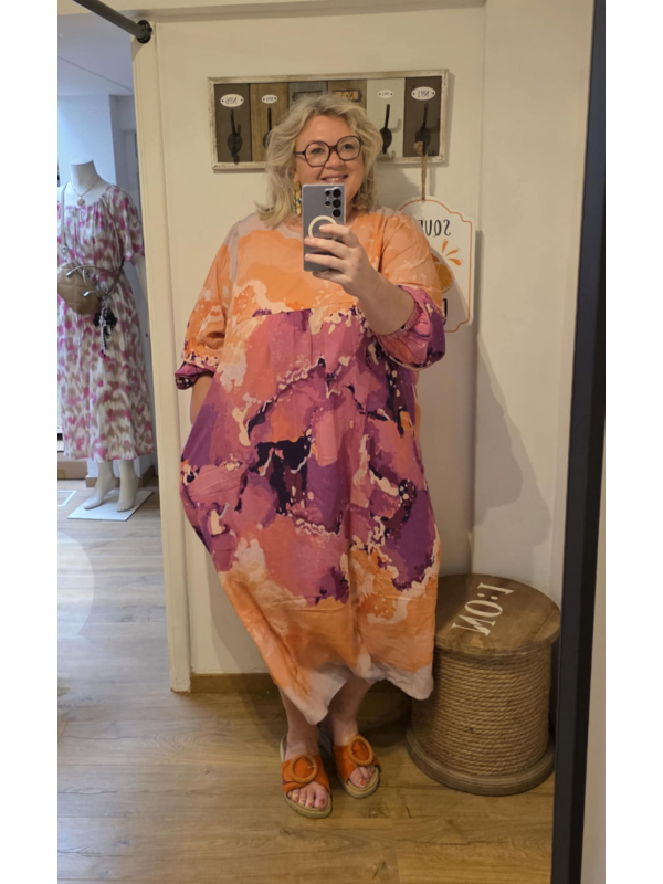 Magnifique robe large multicolore de toute belle qualité. En 100% viscose. Hauteur environ 130 cm. Elle taille bien grand attention pour les tailles. Un exemple le 42/44 correspond plutôt à un grand 44/46.
