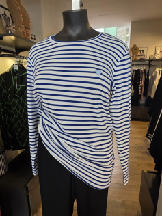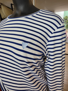 Petit tee-shirt tout mignon ligné bleu et blanc avec un petit coeur bleu brodé sur le côté au niveau de la poitrine. En 45% polyester, 25% viscose, 25% coton et 5% élasthanne. Forme près du corps. Hauteur : 77 cm.