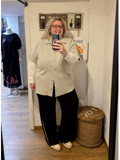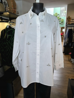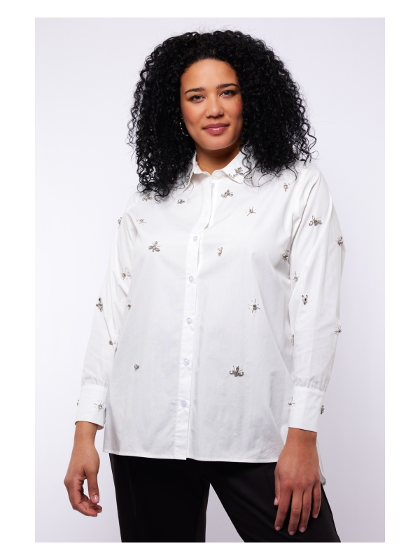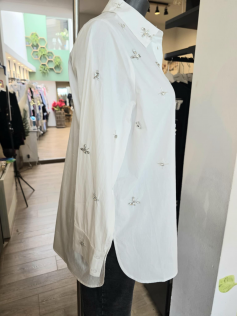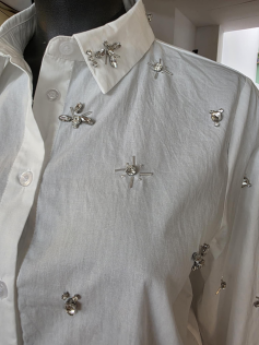 Chemise bijoux avec des strass brodés devant et sur les manches. Elle taille normalement. Je peux la porter mais elle est un peu étroite à la poitrine donc pour un 50/52 ce sera très bien. Et pour la taille en dessous aussi évidemment. En 100% coton. Hauteur : 75 cm.