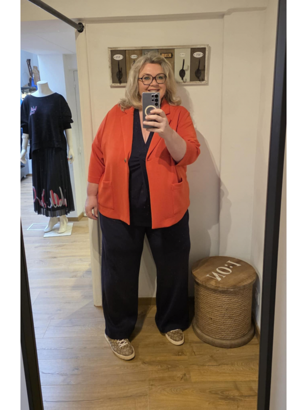 Superbe blazer un peu loose (donc à porter un peu large) non doublé dans une magnifique matière toute douce et agréable. Avec un plis dans le dos, rouge orangé, à porter toute la mi-saison mais aussi l'été le soir, les manches sont 3/4 ce qui le rend plus léger et pour l'entre-saison on peut fair dépasser un sweat, une jolie manche. C'est un modèle casual chic. En 48% modal, 48% polyester et 5% élasthanne. Hauteur : 68 cm.