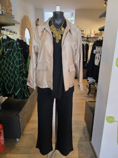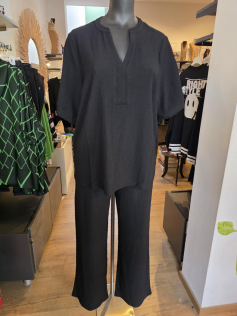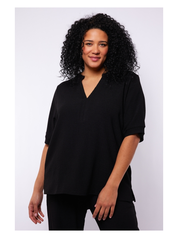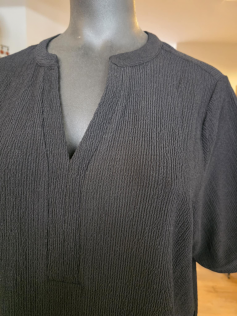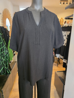 Blouse basique texturée qui fera un superbe ensemble de base à prix compétitif avec le pantalon assorti en suggestion. Forme toute simple, elle est extensible, texturée et elle taille bien (par exemple le 50/52 convient aussi à un bon 52). Hauteur environ 69 cm. En 98% polyester et 2% élasthanne.