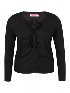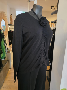 Blouse près du corps en coton avec un lien à nouer autour du coup et une fleur. Le lien permet de régler la hauteur du top. Il est plutôt près du corps mais il est superbe s'il est porter en dessous d'une veste à la façon d'un chemisier, la fleur donnant beaucoup d'originalité au produit. A tester ! Hauteur : 64 cm.