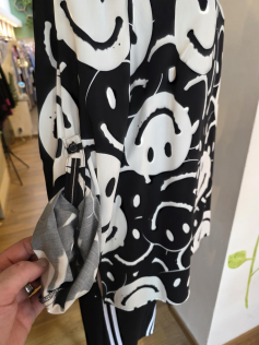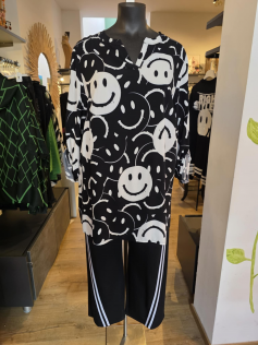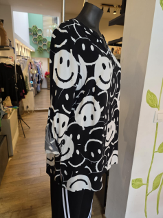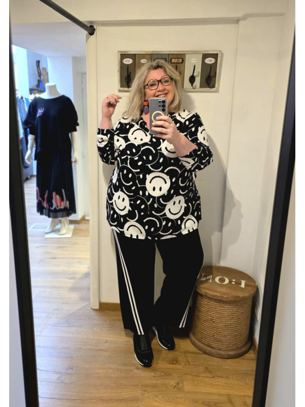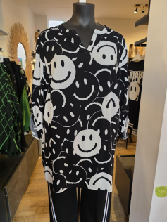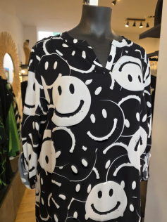 Très belle tunique même adorable avec tous les petits smileys ! En noir et blanc, en 100% viscose, manches 3/4 et patte de boutonnage. Hauteur : 80 cm. Qualité extra et belles finitions.