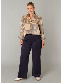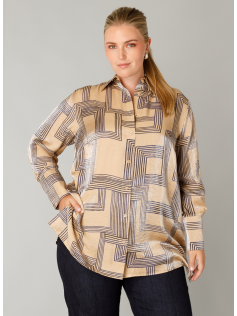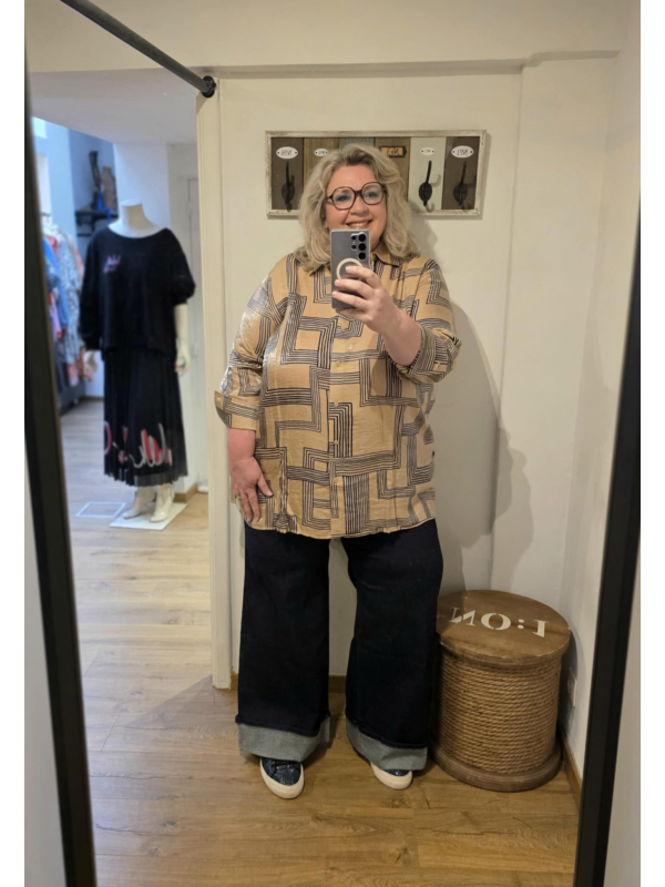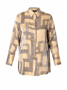 Longue chemise dans un imprimé magnifique avec des reflets dorés en beige et bleu. Fome classique, longue, à porter ouverte ou fermée comme on veut.
