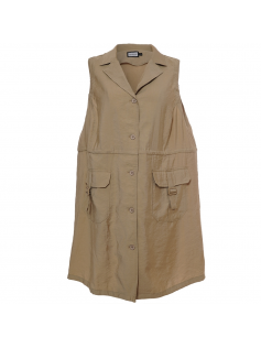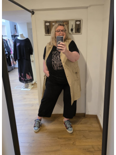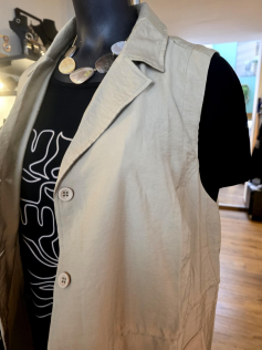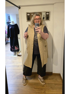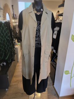 Le gilet sans manches, la veste sans manches, le pull sans manches, c'est la mode du sans manche. Alors celui-ci est léger, long et super agréable. Avec un lien à resserrer à l'intérieur, il va bien avec le thème en suggestion. En 70% bambou et 30% nylon. Hauteur : 97 cm