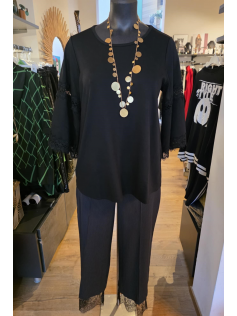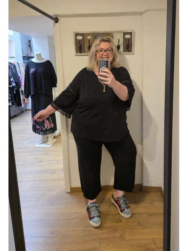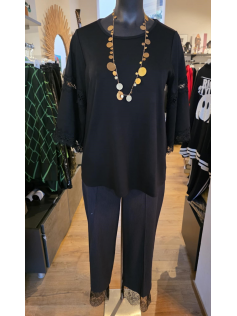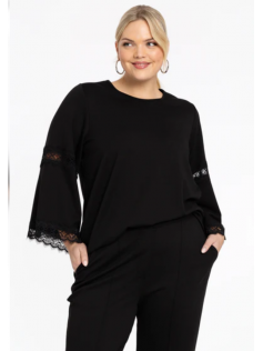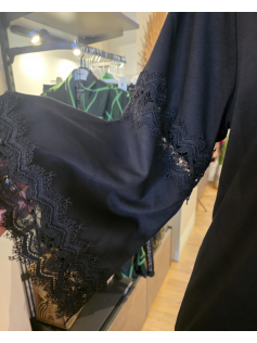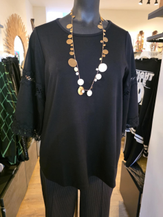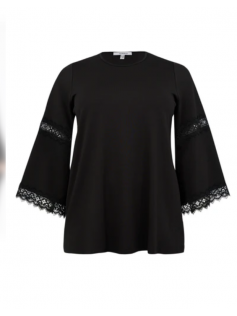 Magnifique sweat de haute qualité forme légèrement en A, avec des grandes manches avec de la dentelle. C'est un genre de coton plus épais en 70% viscose, 25% polyester et 5% élasthanne. Hauteur environ 75 cm. Vous serez toujours bien habillée avec cette pièce chic et facile à porter sur n'importe quel dessous mais aussi avec des colliers.