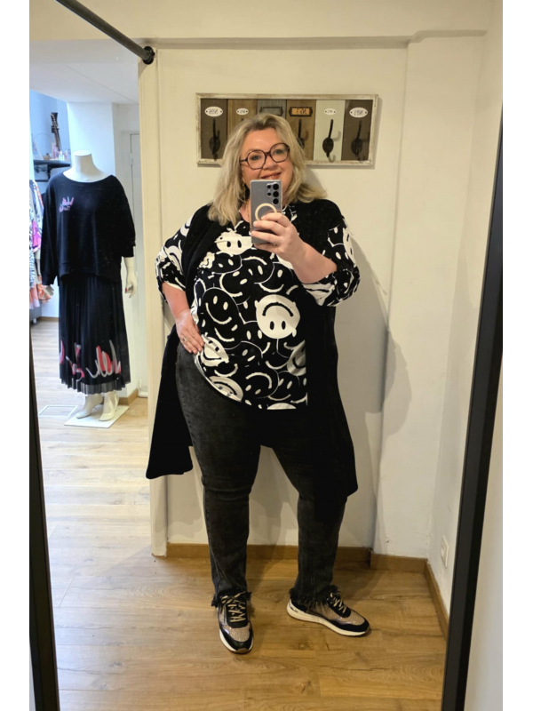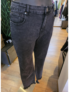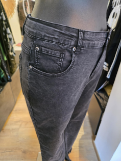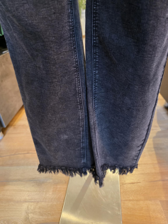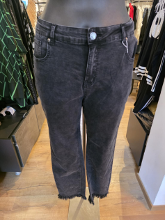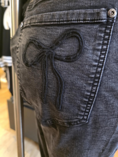 Jeans slim noir délavé avec un noeud brodé sur la poche arrière. Bas frangé et un peu étroit. Il est super extensible et ultra confortable. Entrejambe environ 78 cm.