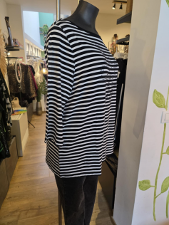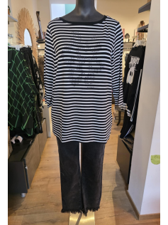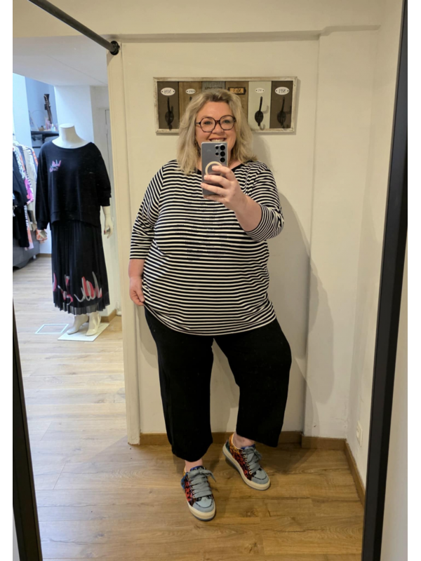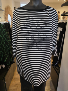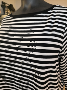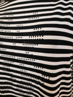 Tee-shirt super léger noir et blanc avec un dessin composé de petits brillants noirs. Facile à porter et intemporel. En 95% viscose et 5% élasthanne. Hauteur : 68 cm
