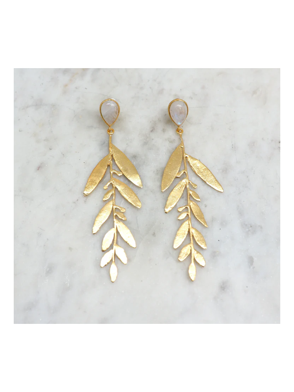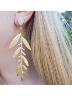 Longues boucles en feuilles de laurier en laiton recouvert d'une fine couche d'or. Elles sont longues, légères et rigides. Petite perle en nacre. Hauteur environ 9 cm.