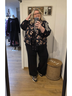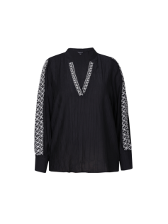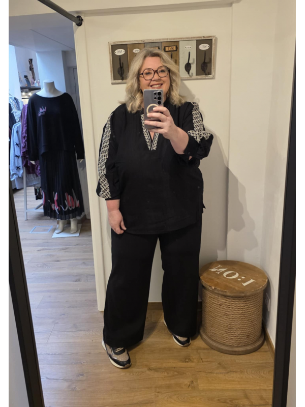 Petit coup de coeur pour cette magnifique blouse noire avec des broderies ecru. Le tissu est magnifique et très léger. Manches avec poignets boutonnés et élastiqués. Hauteur : 70 cm. En 85% rayon et 15% polyamide.