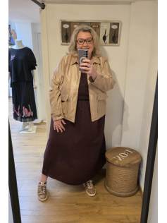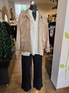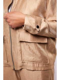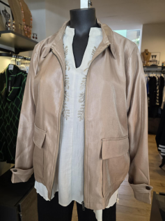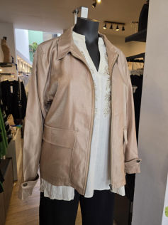 Très jolie veste brillante à la forme sportive qui contraste avec le look du blouson (zippé). Hauteur environ 69 cm. En 82% viscose, 11% polyester et 7% polyamide.