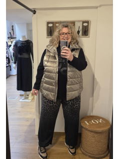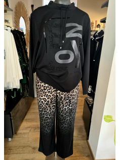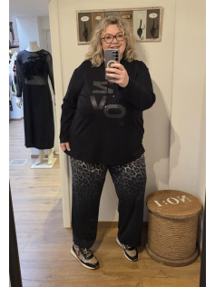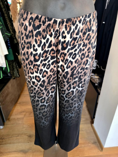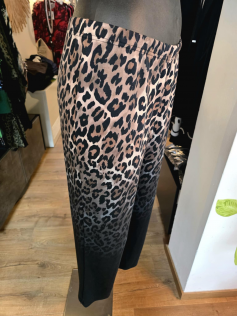 Pantalon en léopard dégradé très original mais surtout très très confortable. Il est tout élastiqué et la matière est super agréable à porter. En 49% coton, 49% modal et 2% élasthanne, c'est un jersey donc très extensible. Entrejambe environ 80 cm. Mélange de gris et de beige donc facile à assortir.