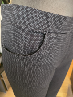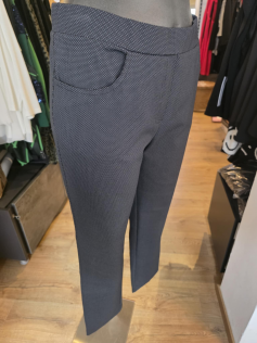 Pantalon très agréable tout élastiqué à 360 degrés. Près du corps, facile d'entretien, sans repassage il ira avec tout et son petit plumetis gris sur noir est très chic. En 64% viscose, 31% polyamide et 5% élasthanne. Entrejambe : 76 cm donc pas trop long.