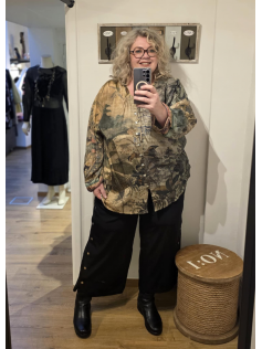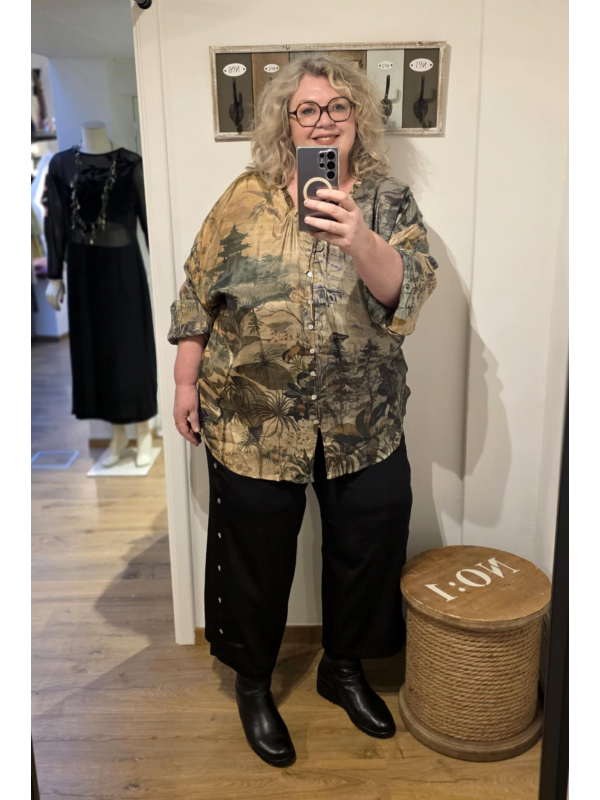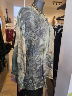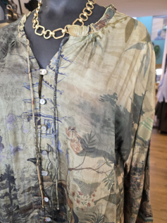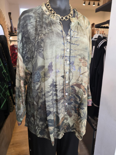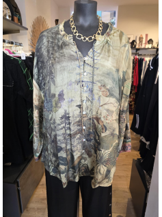 Couleurs automnales et imprimé digital pour cette blouse/chemise boutonnée légère et lumineuse. En 100% rayonne. Hauteur 75 cm.