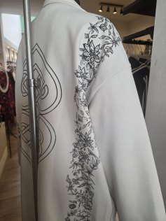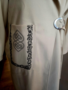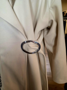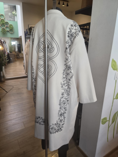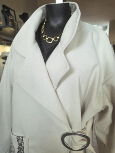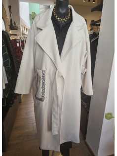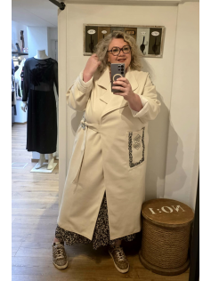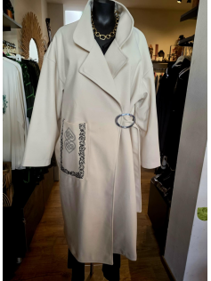 Long manteau blanc cassé en polyester aspect drap de laine mais plus léger et qu'on peut porter dés les premiers frimas car il ne peut pas remplacer le manteau d'hiver. Il n'est pas excessivement chaud mais peut évidemment convenir à celle qui n'a jamais froid. Magnifique dessin noir au dos et sur la poche de devant. A porter ouvert ou fermé avec la boucle sur le côté à resserrer.