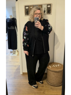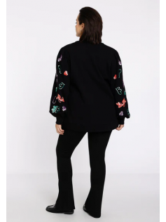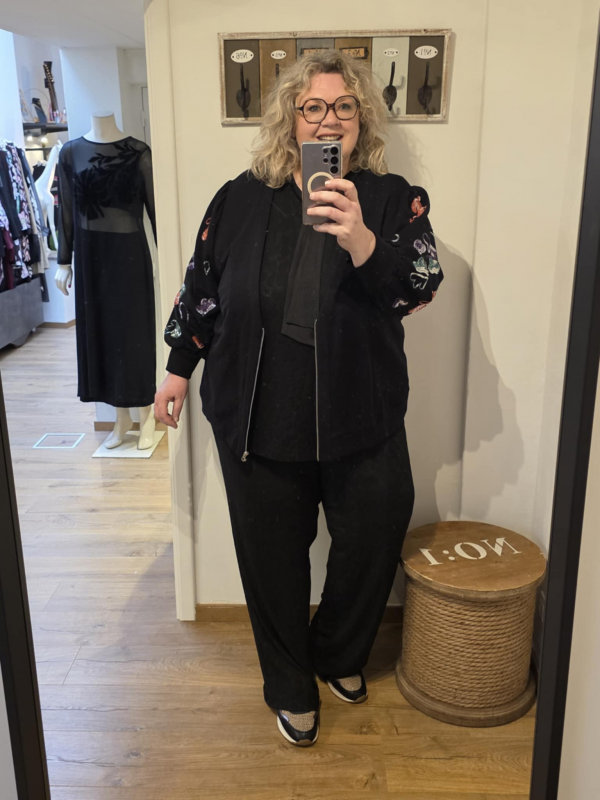 Sweat luxueux en coton (matière sweat shirt) avec des empiècements brillants sur les manches qui sont assez larges. Se ferme devant par une fermeture éclair. Peut se porter en veste sur un ensemble ou une robe. Hauteur environ 73 cm.