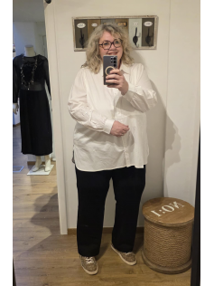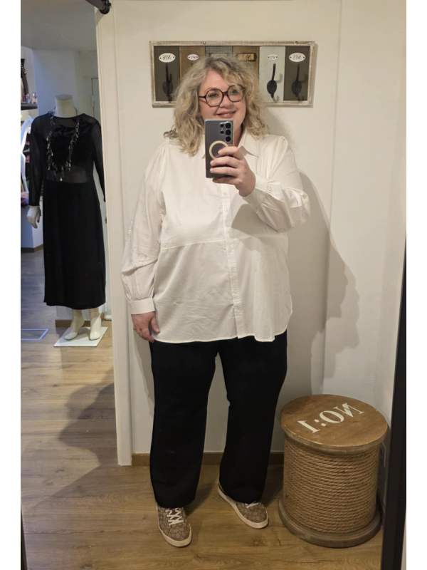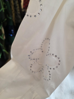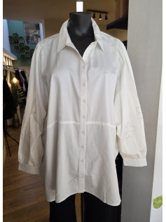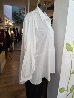 Charmant chemisier blanc de forme un peu large et évasée. Manches larges avec des fleurs brodées et ornées de brillants. En 100 % coton, hauteur : 85 cm. Une belle alternative à la chemise classique dont le détail des manches fera la différence. On peut aussi la porter seule, elle a une très belle coupe.