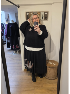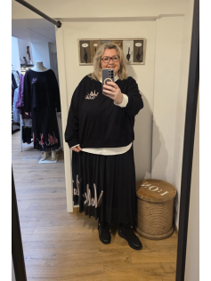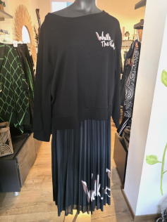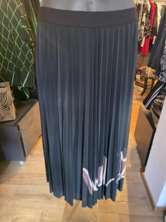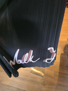 Jupe incroyable, toute plissée. Elle est doublée en jersey de viscose noir. Le dessus est en voile extensible polyester mais de très belle qualité. Inscription walk dans le bas sur le côté en rose et gris. Taille élastiquée. Elle est bien longue : 90 cm. Et elle taille super bien.