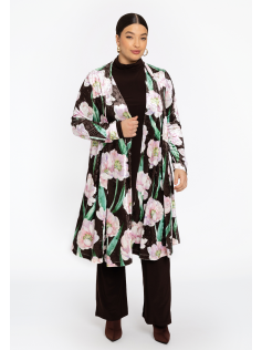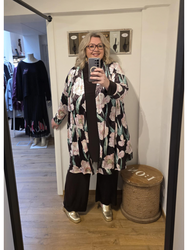 Magnifique long cardigan en panne de velours ras. Superbes coloris mis en valeur par le velours. Forme en A, fermeture bord à bord. A porter avec du marron ou du noir en dessous, sur un ensemble ou une robe. Hauteur environ 100 cm.