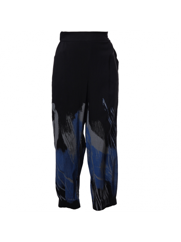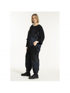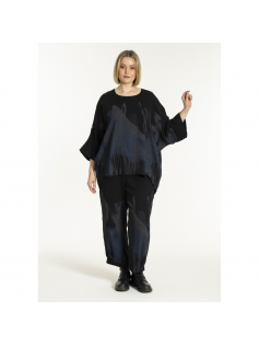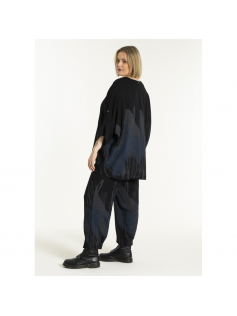 Pantalon un peu large mais pas trop (il me convient mais est tout juste au niveau des cuisses). Taille élastiquée. Très beau tissu (toujours un secret de tissus magnifiques chez Gozzip) noir avec ramages gris et une pointe de bleu cobalt. En 80% viscose et 20% nylon. Entrejambe : 70 cm, il n'est pas super long mais convient bien avec des bottines. il est un peu resserré dans le bas mais légèrement. A porter avec les deux tuniques assorties, c'est absolument superbe et original.