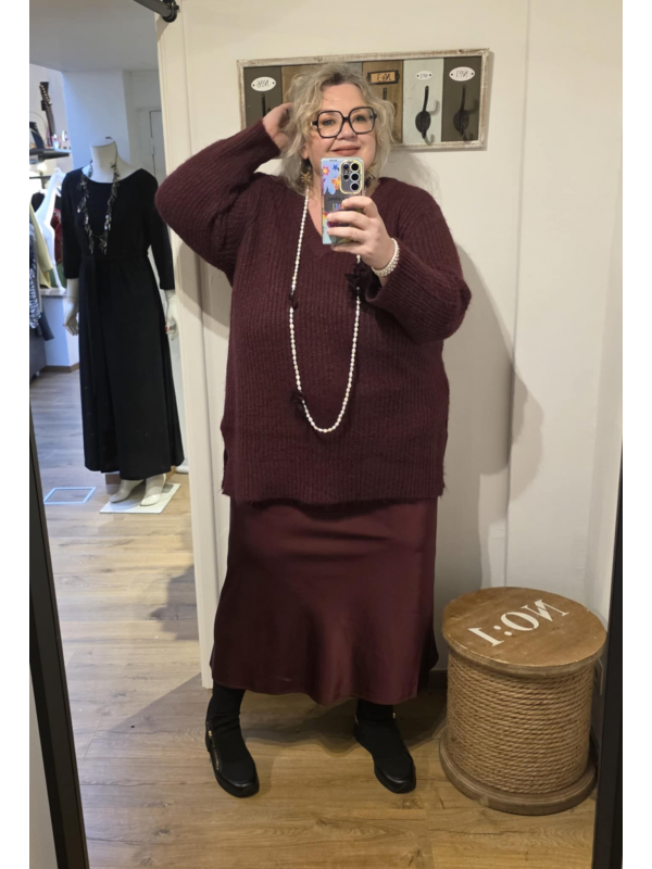 Long pull douillet en beau bordeaux avec fentes sur les côtés et col v. En 64% polyester, 18% acrylique, 10% laine, 5% alpaca et 3% élasthanne. Look un peu ample mais pas oversize. Hauteur environ 88 cm.
