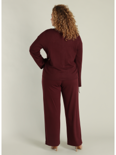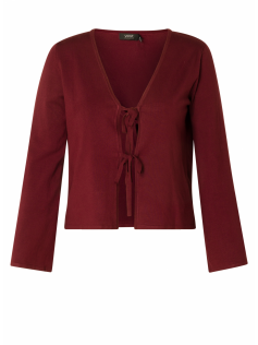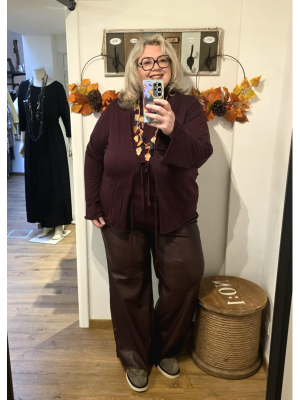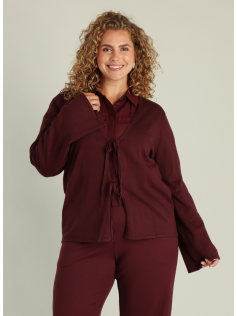 Petit gilet tout fin (moins rouge que sur la photo et qui correspond aux couleurs du thème. Avec petits liens à nouer. En twin set avec le col roulé. En 81% viscose et 18% polyester. Hauteur : 65 cm.