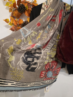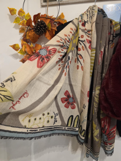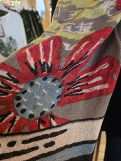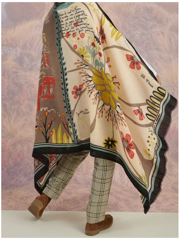 Foulard d'exception en 100% laine finement tissée. il ne pique pas, il est contraire tout doux et on ne sent pas que c'est de la laine, on dirait du lin épais. Il tient évidemment chaud mais au premier abord, cela ne donne pas cette impression. Largeur 100 cm, longueur 190 cm.
