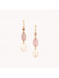 Grandes boucles en laiton, jaspe paysage, nacre brune et Howlite, dorées à l'or fin. Hauteur 7 cm.