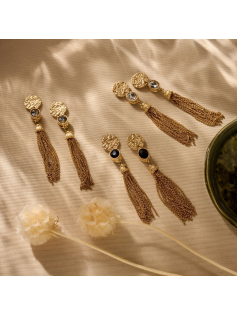 Longues boucles chaînes dorées avec perle de verre grise. Légères. Fines. Longueur : 9.5 cm