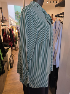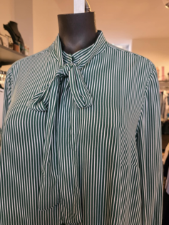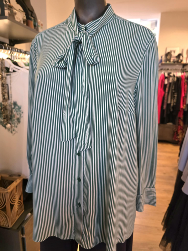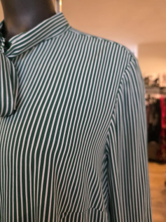 Très beau chemisier ligné vert sapin et blanc. Col mao avec lavalière super belle mais que vous pouvez retirer pour celles qui ne sont pas fan comme moi. En 100% viscose. Hauteur : 70 cm