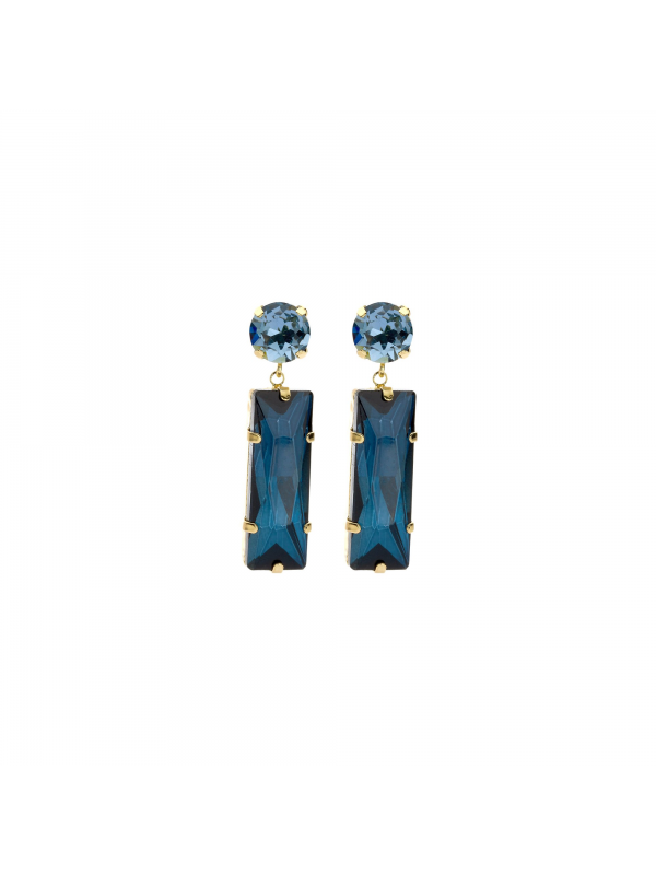 Superbes boucles en strass bleu. Métal doré sans nickel. Hauteur : 4.5 cm, hauteur passe-partout qui convient à toutes.
