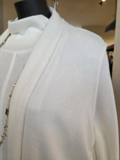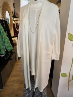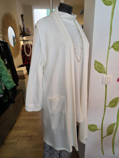 Long gilet tout doux et chaud en blanc cassé qui donne bonne mine et du peps à la saison. Avec poches devant. Longueur environ 90 cm. Peut se porter avec plein de jolies blouses aux jolies manches et même sur une robe. En 40% viscose, 40% rayon et 20% élasthanne.