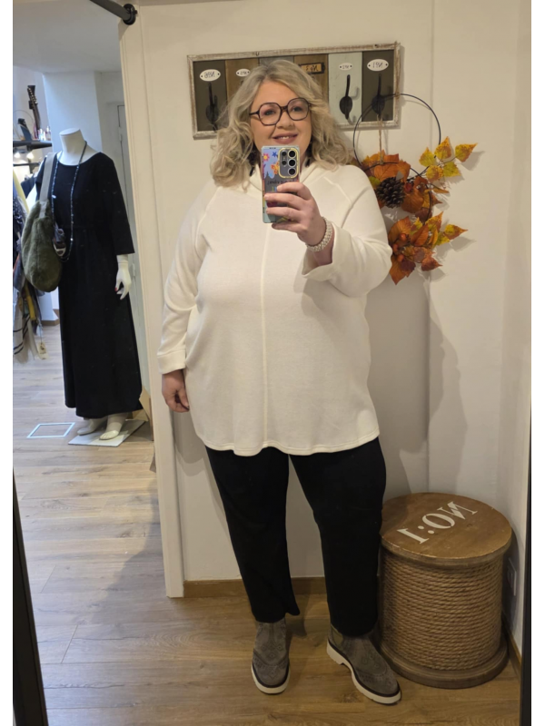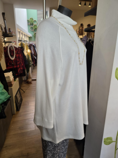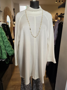 Pull de magnifique qualité, agréable et doux. Forme un peu évasée et petit col cheminée. En 40% viscose, 40% rayon et 20% polyamide. Longueur environ 88 cm. A porter seul mais aussi en twin-set avec le long gilet assorti pour les frileuses (parce que c'est quand même chaud). Ce qui est intéressant c'est la chaleur sans le lainage ou tricot. Il taille bien.