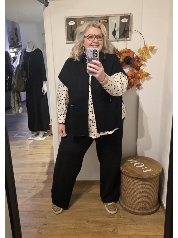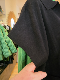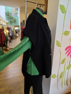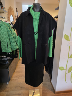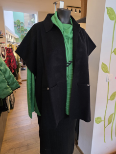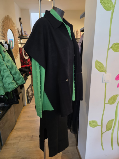 Très beau gilet style cape avec un bouton sur le côté et un petit col. Forme ample facile à porter et qui nécessite de l'ampleur. On notera la qualité de la matière toute douce et élastiquée mais qui se tient bien car un peu épaisse. En mélange de viscose et polyester. Hauteur : 74 cm