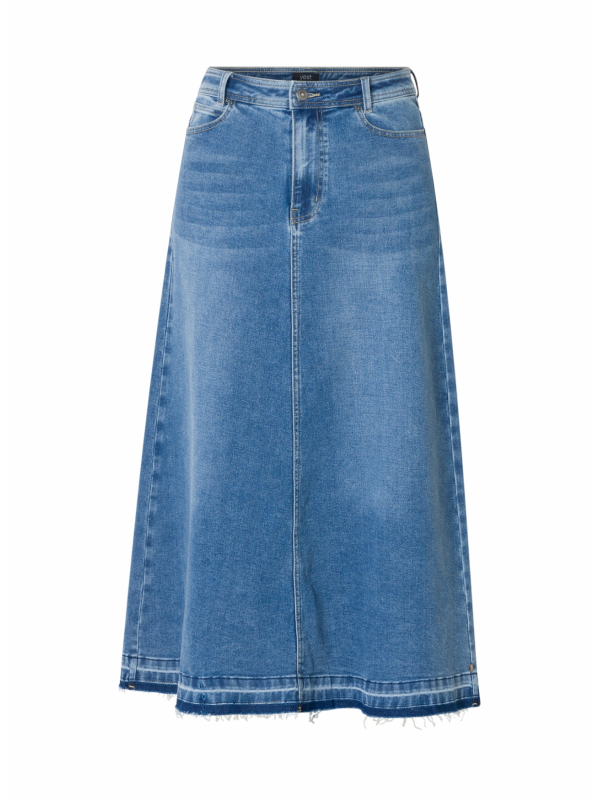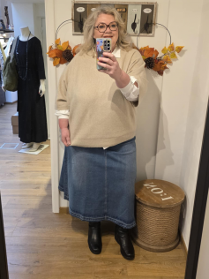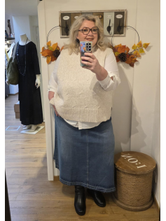 Longue jupe en jeans évasée très confortable. Elle taille bien. En 95% coton et 5% élasthanne. Hauteur : 95 cm. Vraiment chouette à porter.