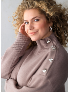 Beau pull avec col montant et boutons style noeuds argentés. On peut défaire les deux premiers boutons et le porter plus ouvert. Manches un peu large mais pas trop qu'on peut retrousser. En 50% viscose, 28% polyester et 22% nylon. Hauteur : 68 cm