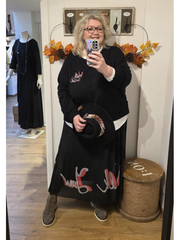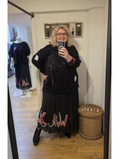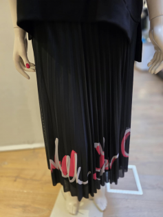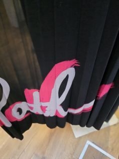 Jupe incroyable, toute plissée. Elle est doublée en jersey de viscose noir. Le dessus est en voile extensible polyester mais de très belle qualité. Inscription walk dans le bas sur le côté en rose et gris. Taille élastiquée. Elle est bien longue : 90 cm. Et elle taille super bien.