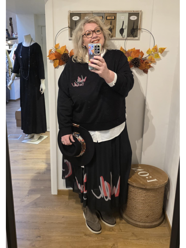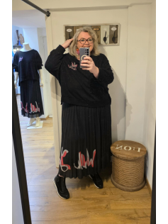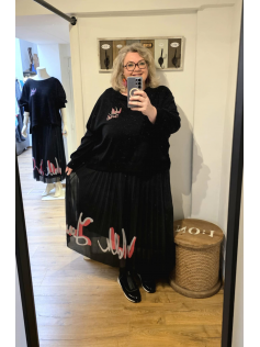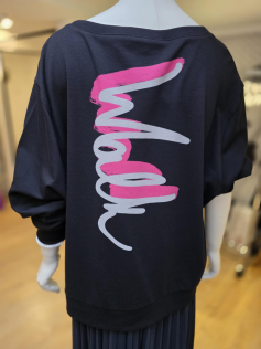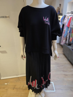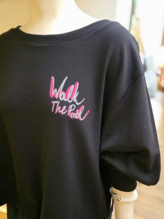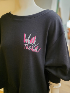 Super sweat très sportswear oversize avec encolure un peu large, des grandes manches à relever. Il est un peu plus long à l'arrière avec une grande inscription; C'est un vrai coup de coeur, très mode. En 49% modal, 49% coton et 2% élasthanne. Il taille grand. Hauteur environ 72 cm.