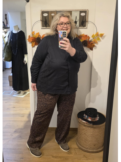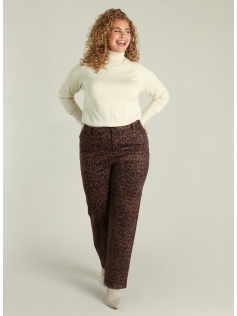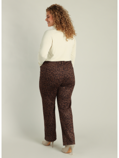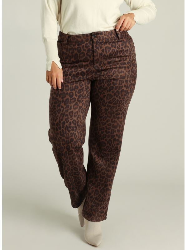 Pantalon imprimé léopard au toucher peau de pêche très agréable et doux. Forme style 5 pockets avec jambe droite. En 100% polyester. Matière confortable. Entrejambe : 80 cm