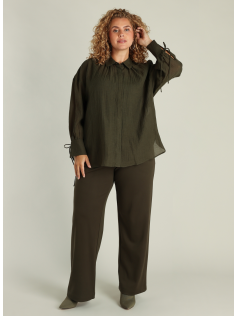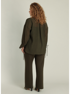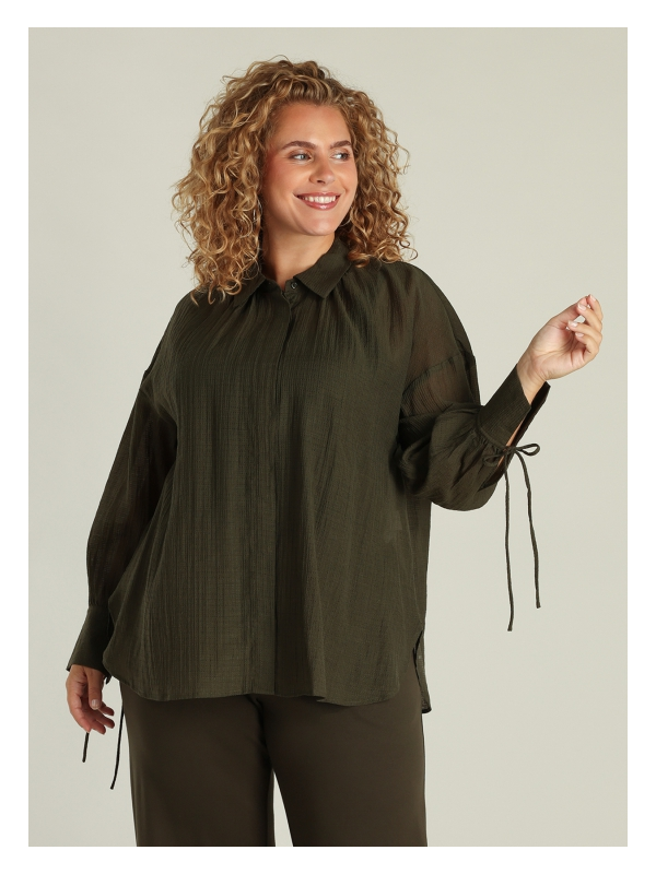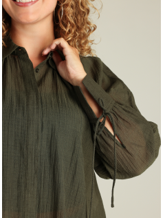 Très joli chemisier tout léger dans un beau kaki foncé. Tissu un peu texturé, jolies manches avec petits liens à nouer. En 70% viscose et 30% polyamide. Hauteur : 76 cm.
