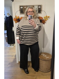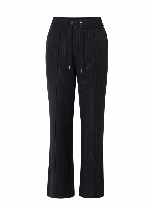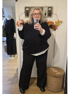 Magnifique pantalon noir que je dois encore photographier un peu mieux pour que vous puissiez voir la fine ligne légèrement argentée dans le tissu qui est magnifique et souple et un peu épais quand même. Jambes larges à la mode et taille élastiquée, il taille bien. En 80% polyester, 17% viscose et 3% élasthanne. Entrejambe : 80 cm.