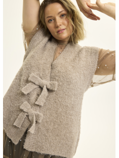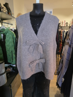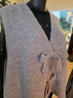 Adorable gilet sans manches beige taupe avec des gros noeuds devant qui le rende irrésistible ! Il est tout mousseux et bien chaud. En 73% polyester, 13% nylon, 8% laine et 6% élasthanne. Hauteur environ 68 cm.