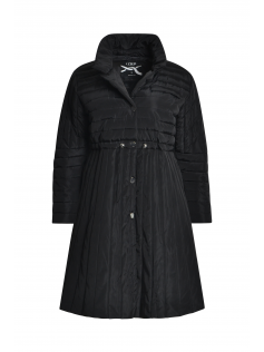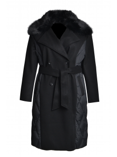 Magnifique manteau en mélange de différents tissus style drap de laine et doudoune au dos. Avec un grand col en fausse fourrure et une ceinture. Double boutonnage. Hauteur environ 105 cm.