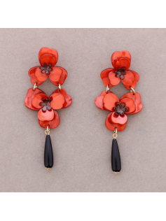 Longues boucles fleurs rouge orange (en fonction de la lumière) en résine super légères. Hauteur 10 cm. Tige sans nickel.