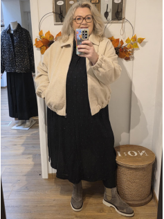 Veste style mouton et forme bomber très tendance cette saison. A porter aussi sur une robe, c'est très sympa ou un pantalon très large. En 100% polyester. Fermeture éclair. Hauteur : 65 cm